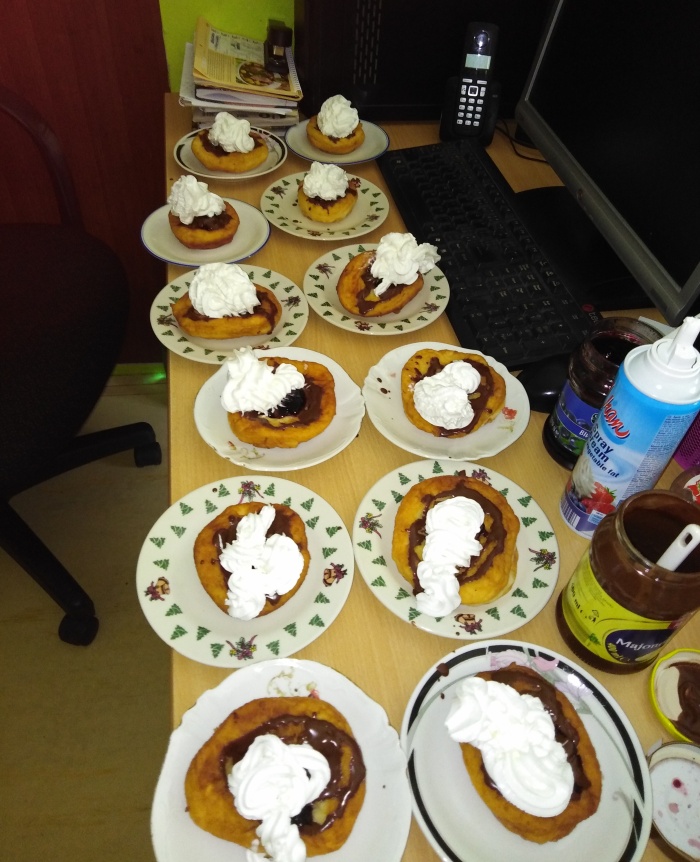 Každé z nich dostalo za vysvedčenie sladkú odmenu. Pochutnali si na šiškách s lekvárom, čokoládou a šľahačkou, ktoré pre ne pripravila odborná pracovníčka nášho komunitného centra Marta Demeová.